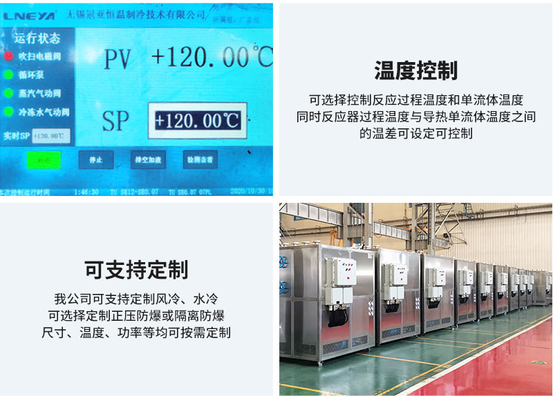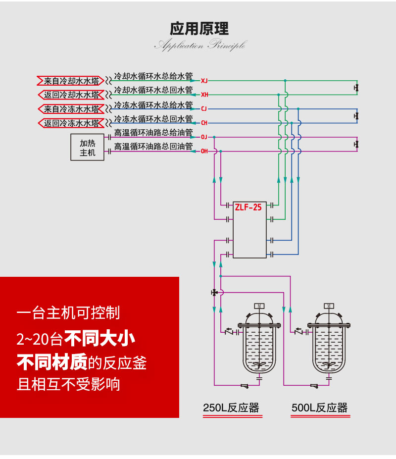 | ZLF-N | 采用主冷源/或主熱源通過(guò)比例調(diào)節(jié)系統(tǒng)流量,控制進(jìn)入反應(yīng)釜夾套的熱量,同時(shí)還有一組用于加熱或冷卻的換熱器控制升溫或降溫 | ||||